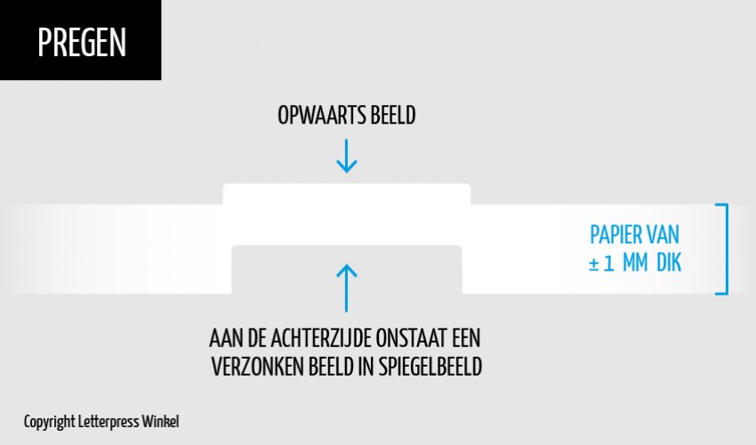 Wil je beeld omhoog brengen dan gebruiken we de preeg-techniek. Het beeld wordt van achter naar voren gedrukt door twee in elkaar passende drukvormen. Aan de achterzijde van je kaart ontstaat dus een verzonken beeld in spiegelbeeld.