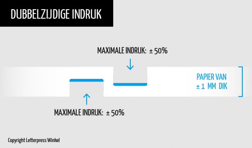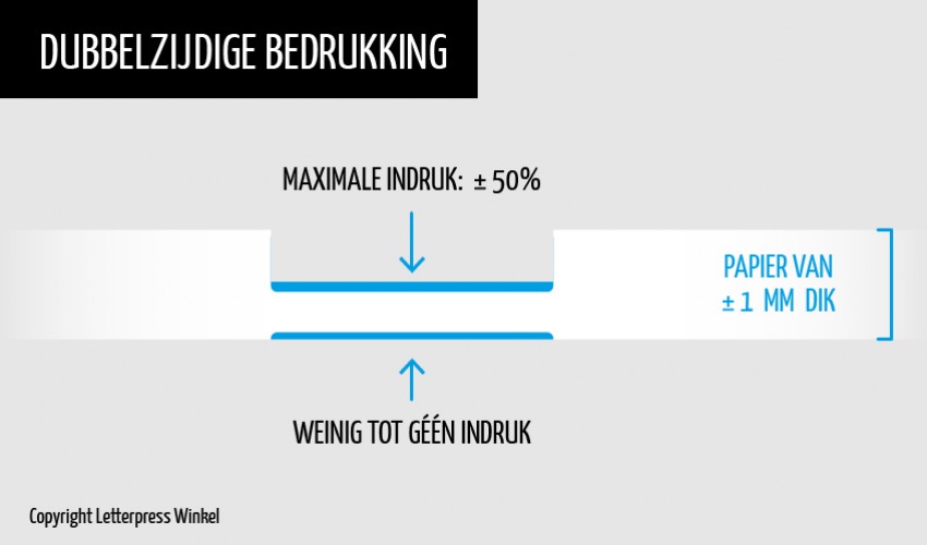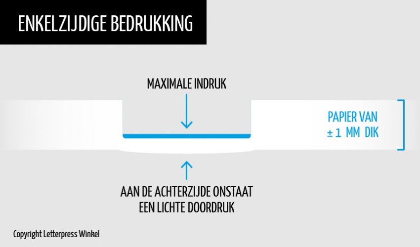 De diepste indruk behalen we met een enkelzijdige bedrukking, zo kunnen we het beeld helemaal doordrukken tot bijna aan de achterzijde. Met zo’n diepe druk komt het soms voor dat dit aan de achterzijde een klein beetje zichtbaar is, dit heet ’moetvorming’, bij een onbedrukte achterzijde is dit natuurlijk prima.