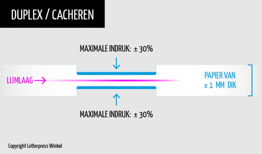 Let op, de diepte van een indruk en het effect wat de indruk uiteindelijk geeft is vooral afhankelijk van het type beeld wat we drukken! De kwaliteit van een indruk is dus zeker niet alleen afhankelijk van het enkel- of dubbelzijdig bedrukken van een kaart.