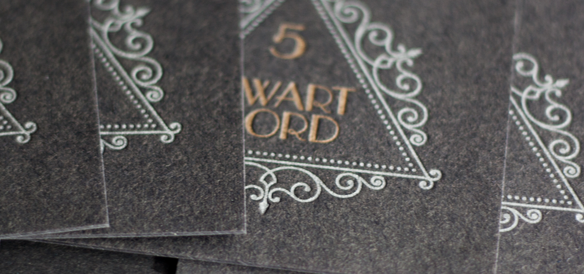 Een door-en-door zwart / antraciet gekleurd papier, het heeft een beetje dezelfde eigenschappen als ons Linnenbord. Zwart-bord is een wat taaier papier en bedrukken we voornamelijk met metallic-inkten en folies. Het is vooral erg geschikt voor kleinere kaarten, visitekaartjes en bijvoorbeeld labels.