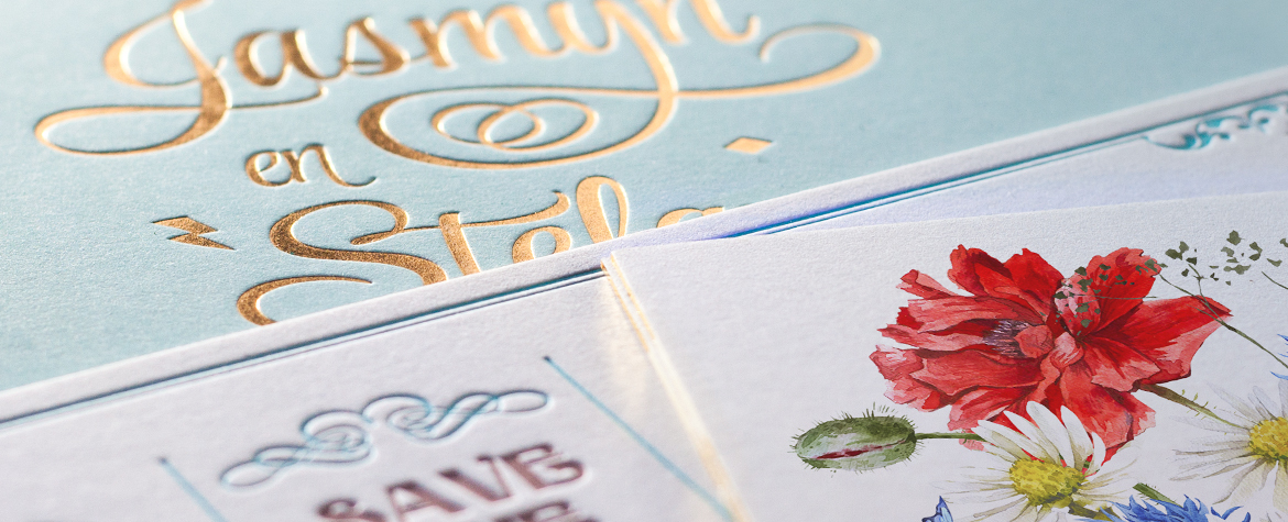 Wanneer je zelf je trouwkaarten ontwerpt dan kunnen we je adviseren over materialen en technieken, we kunnen je helpen het mooiste resultaat uit je ontwerp te halen. Met onze speciale afwerkingen zoals kleur op snede, blind-druk, duplexen, triplexen, stansen, pregen of foliedruk maken we ieder project uniek.