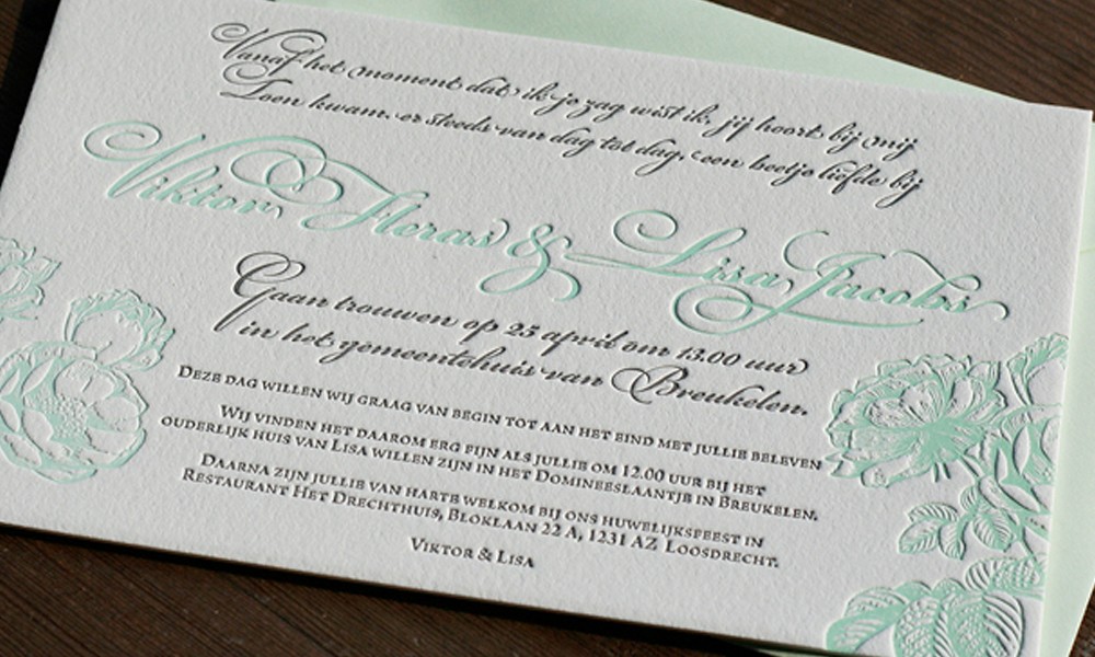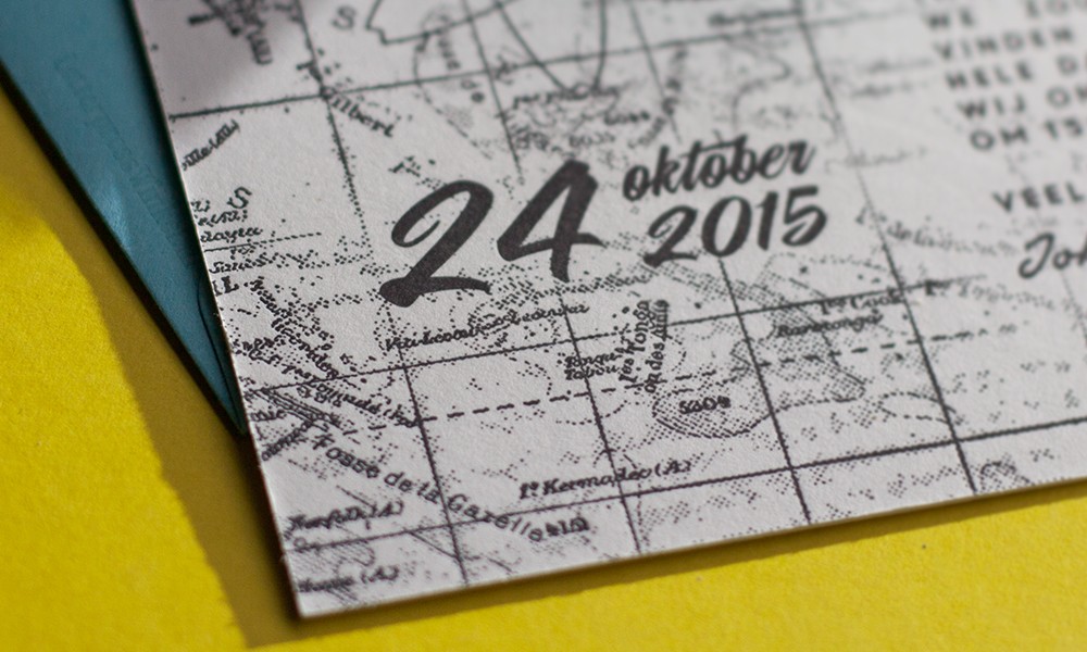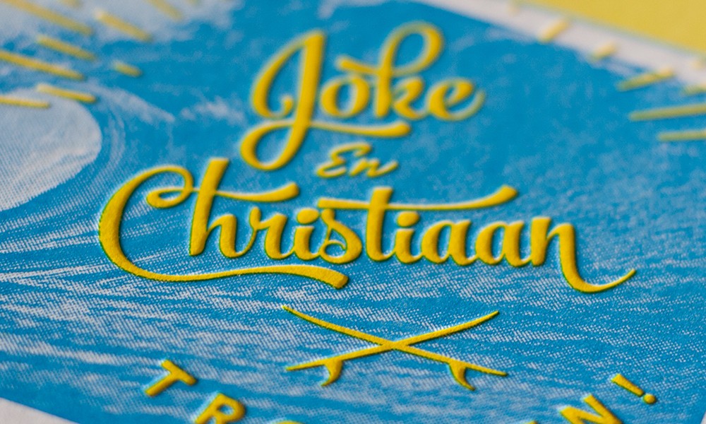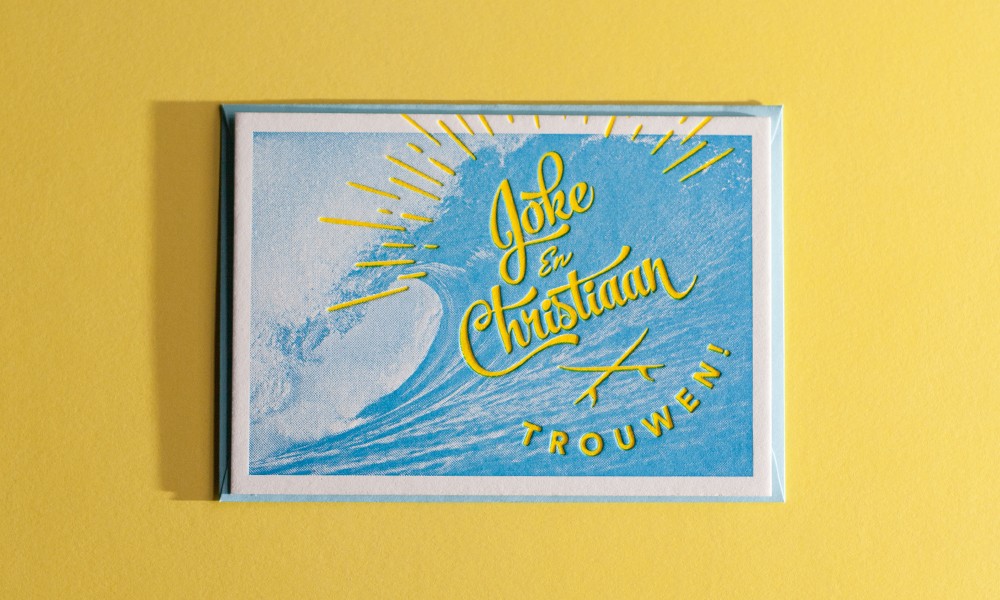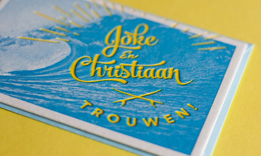 Voor het huwelijk van Joke & Christiaan drukten we deze stoere kaarten met een combinatie van halftone-rasters en letterpress.
