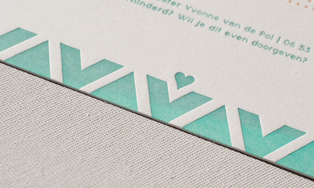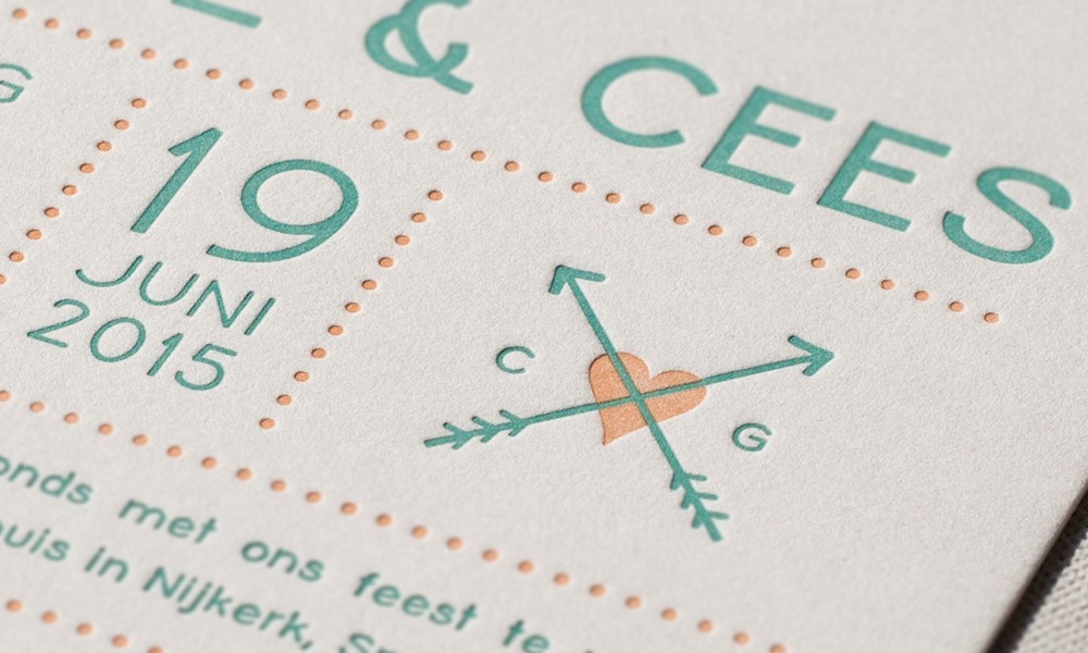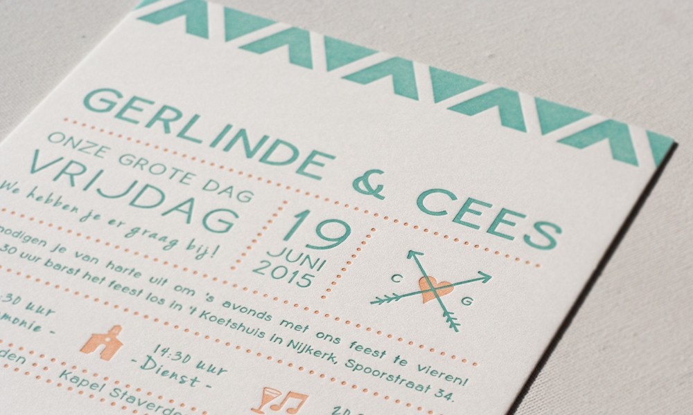 Voor het huwelijk van Gerlinde & Cees drukten we deze mooie kaarten letterpress trouwkaarten. De ontwerpster van deze kaart koos voor een leuke bohemian stijl in pasteltinten.