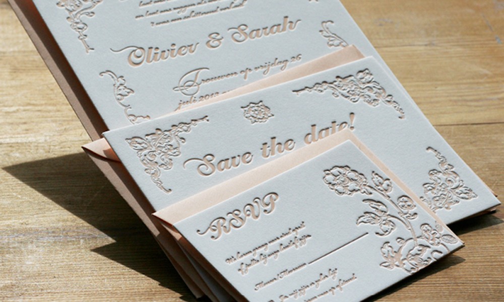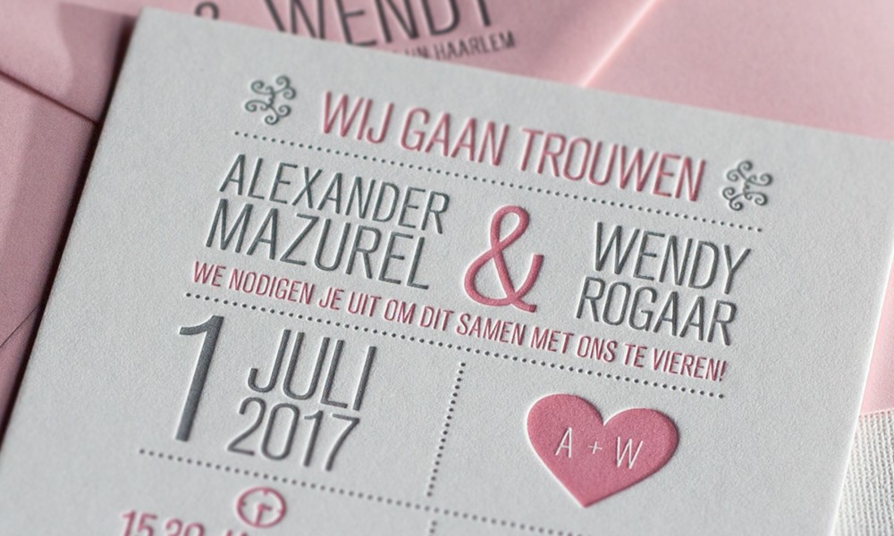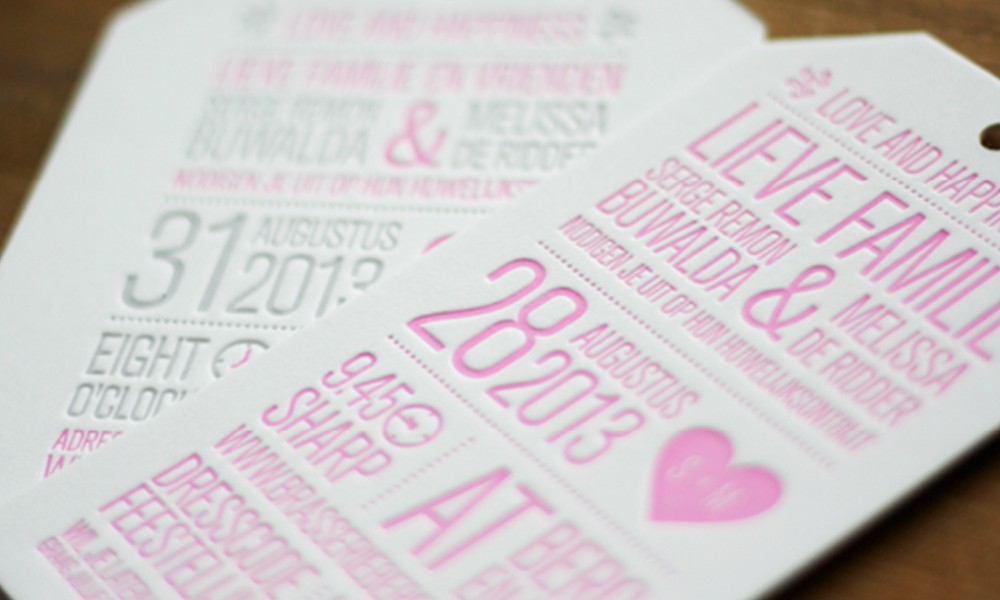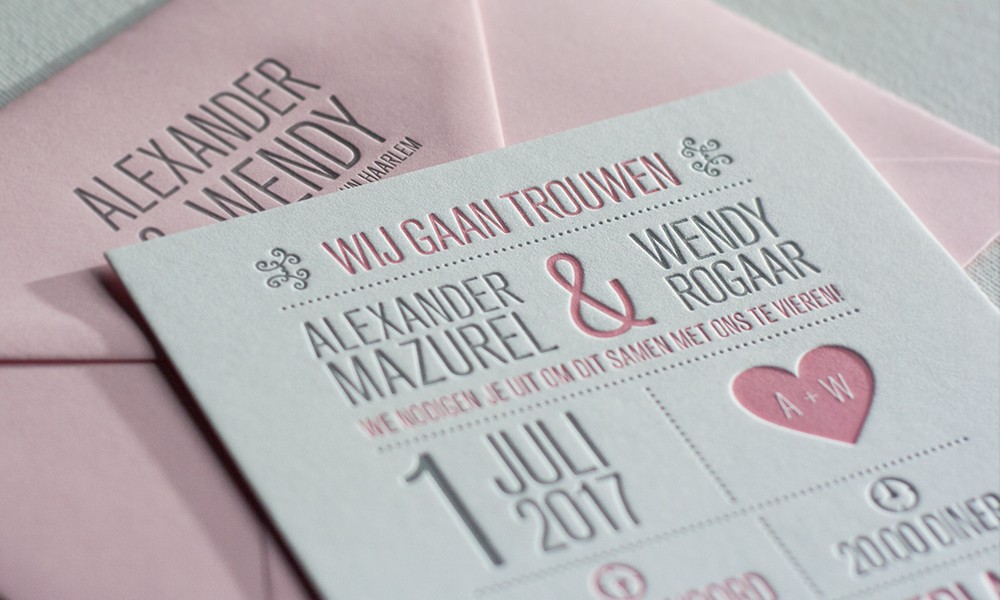 Klassieke en elegante letterpress trouwkaarten. De stijlvolle indeling van de tekst zorgt voor een speels en toch overzichtelijk geheel. Enkelzijdig gedrukt in 2 kleuren, de kleuren zijn vrij te kiezen bij het samenstellen van je order. Leverbaar in diverse formaten en met diverse toevoegingen zoals Save the Date kaarten, RSVP kaarten, bedank kaartjes, menukaarten en passende enveloppen naar keuze.